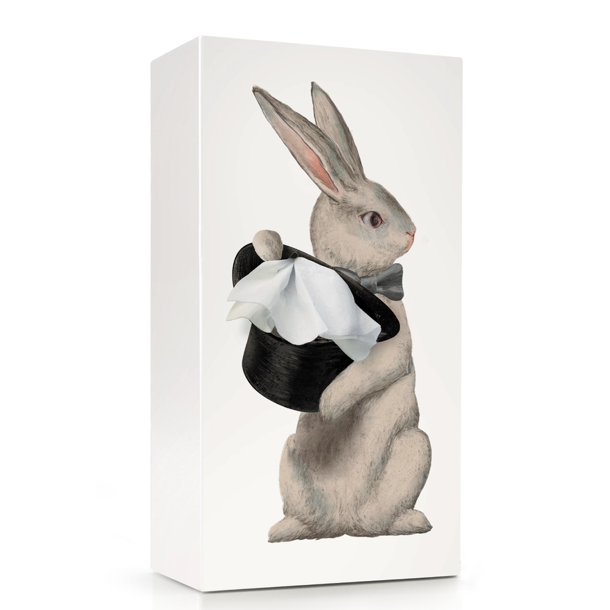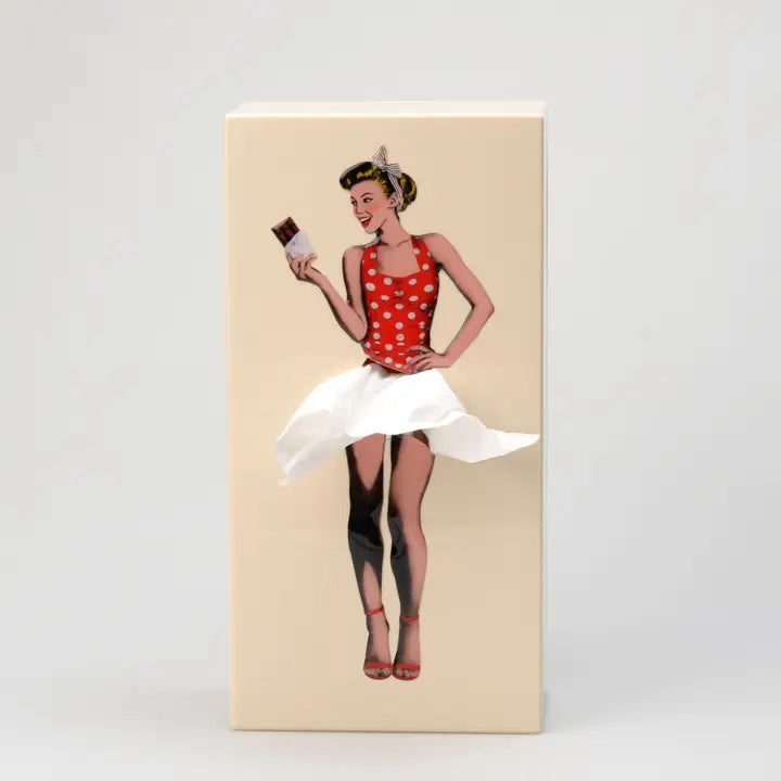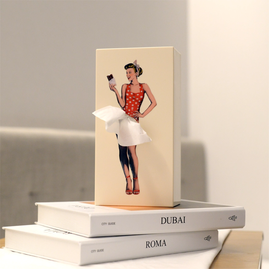 These tissue holders feature resin-embossed pop art print, four anti-slip pads, a slidable inner case for tissue storage, and a metal-weighted base. The specially designed 3D contour inside the holder naturally guides the tissue into a skirt shape with every pull.