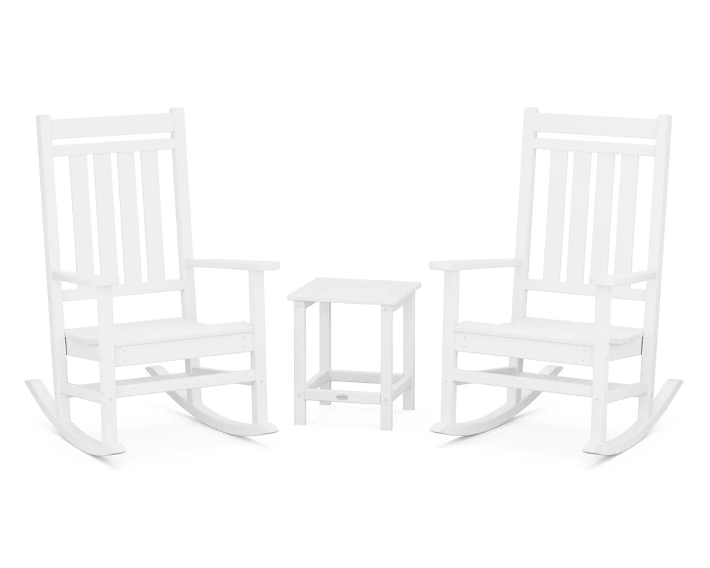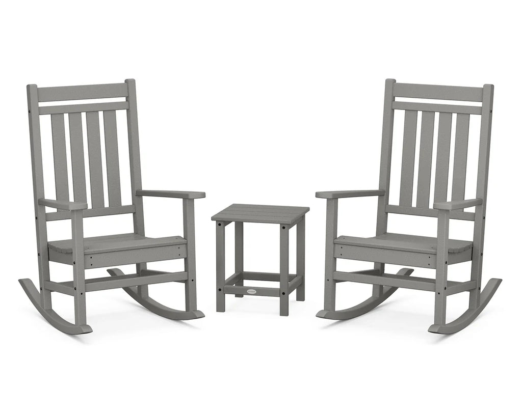 Enhance your front porch with a touch of tradition with the Estate 3-Piece Rocking Chair Set. This classic all-weather set features straight lines paired with a comfortably curved seat — an ideal set for relaxing on the front porch and enjoying the sunrise.