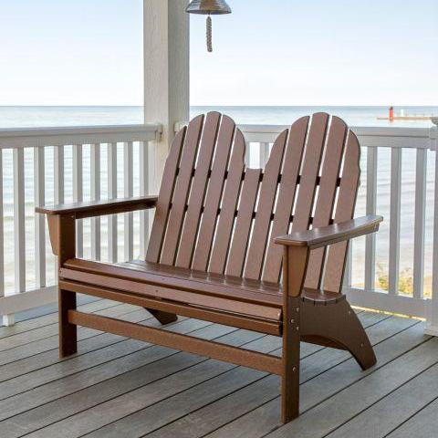 The Vineyard Adirondack Bench seats two and features a comfortably curved seat and waterfall front. This classic, coastal Adirondack back design and sleek leg profile will look great in any outdoor space and pairs well with any POLYWOOD® side table.