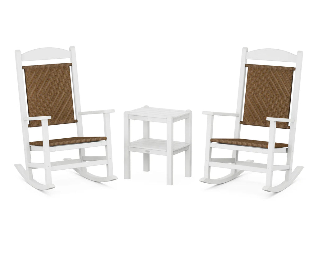 Rock and lull into total relaxation together. Our Presidential 3 Pc Woven Rocking Chair Set is the perfect place for leisurely days on your porch, waving to passersby and reveling in the fresh air. The two rockers move in a soothing back-and-forth motion, and a coordinating side table keeps tea mugs or whiskey sours close by.