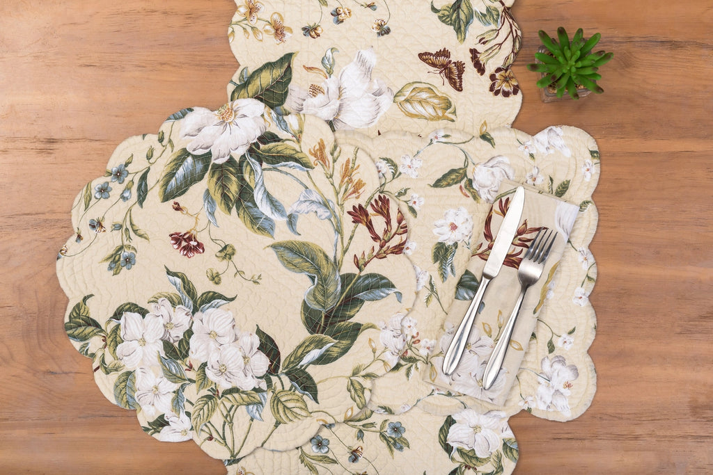 Created in collaboration with the Colonial Williamsburg Foundation, this cotton runner beautifully showcases the timeless elegance of the magnolia. Featuring crisp white magnolias framed by flowing leaves and delicate flower stems, this design captures the grace and artistry of nature. Set against a natural background, the palette of icy blue, earthy green, and brassy yellow adds warmth and depth, making these linens a versatile addition to any table setting. For added flexibility, the reverse side features a smaller magnolia and vine pattern, allowing for more negative space and creating a softer, more delicate look.